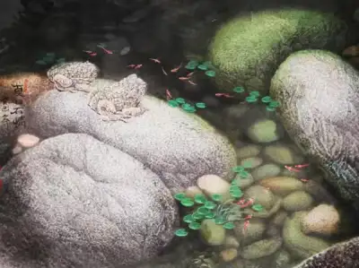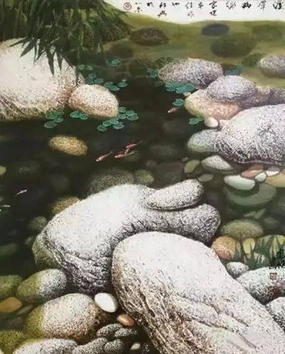 纵观姚家恺先生的溪水鱼石的超级写实,既来源于传统的绘画之法,又在前人之基础上有所突破,有所创新,这显然是难能可贵的!其技法与艺术成就为中国绘画平添了一种新的艺术符号与创新景观。为中国画的发展做出了很大贡献!望百尺竿头更进一步。