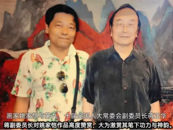 第九、十届全国人大常委会副委员长蒋正华观看展览后对姚家恺作品盛赞:“你的作品让人眼前一亮!你画的是心境、意境,不仅仅是形,更赋予了灵魂!既有传统的深厚功力,又透着独特的个人气韵。”欣然与姚家恺合影。
