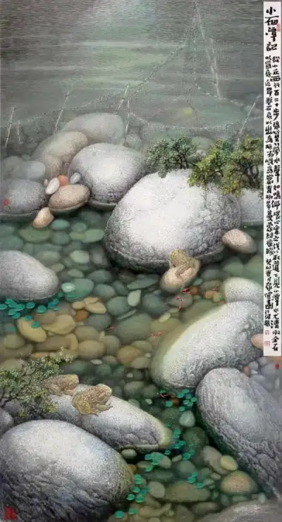 家恺的潭石画,在国画界从题材内容上讲,是前无古人的;从绘画技法层面讲是高难度且具有创造性的。看看水中的卵石和露出水面卵石的色彩、形态和质量感,再看看卵石半浸于潭中水痕的深入刻画,不难知道作者为此付出的辛勤劳动。他把皴、擦、点、染的传统技法运用得极其巧妙;用色上则是吸取了西画复合色入画的长处,使得画面色调和谐浑然一体,不乏生动鲜活之感。这些深入的刻画正是其潭石作品引人注目的魅力所在。