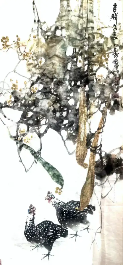 姚家恺的写意画,气韵生动!笔墨纵横间,花鸟形神兼备,意态盎然。他的潭石画,鹅卵石,圆润如玉,似在清流中经年涤荡,温润可喜;水中游鱼轻灵如影,摇曳生姿,仿佛下一刻便要跃出纸面。树木枝干虬曲苍劲,墨色浓淡交织,既有力度又不失空灵,与水色交融处尤见虚实相生之妙。