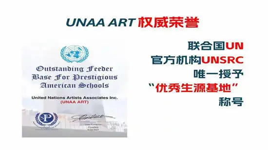 UNITED NATIONS ARTISTS ASSOCIATES INC. 2011年美国纽约注册。UNAA ART隶属于本协会,2018年建校于纽约,是北美TOP级、纽约知名的美国本土艺培机构。每年升学率达100%,名校录取率及高额/全额奖学金获取率达95%以上。