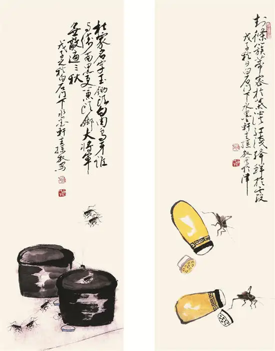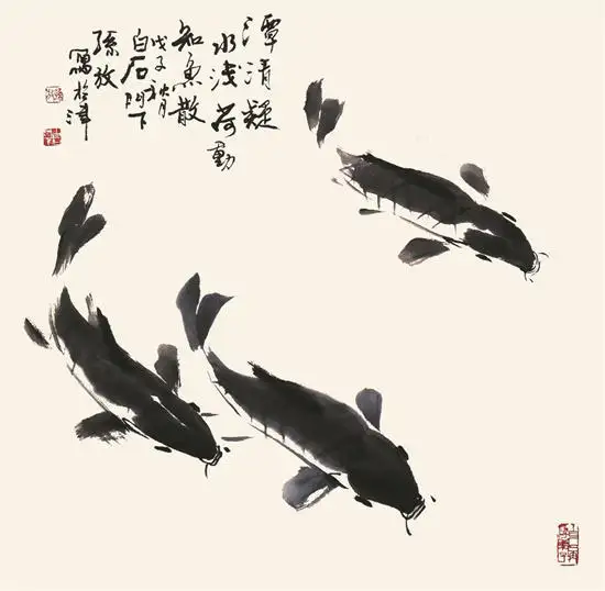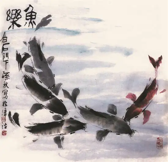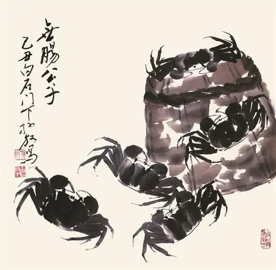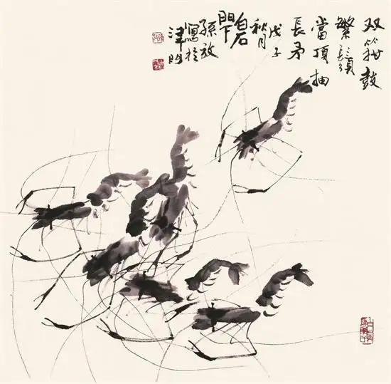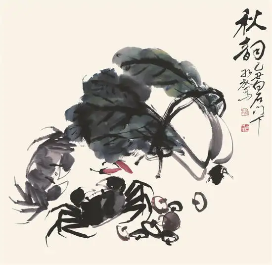 孙放先生画的水墨虾蟹,不仅从构图上有疏密、繁简、虚实之关系,而且从笔墨上有一定精到之处。一笔之中用墨时浓时淡,在墨色统一的基础上稍有变化。正如明代画家、理论家方薰可说“墨者谦素,笼统一片,是为死墨、浓淡分明,便是活墨,活墨有光,不可不为辨也”。