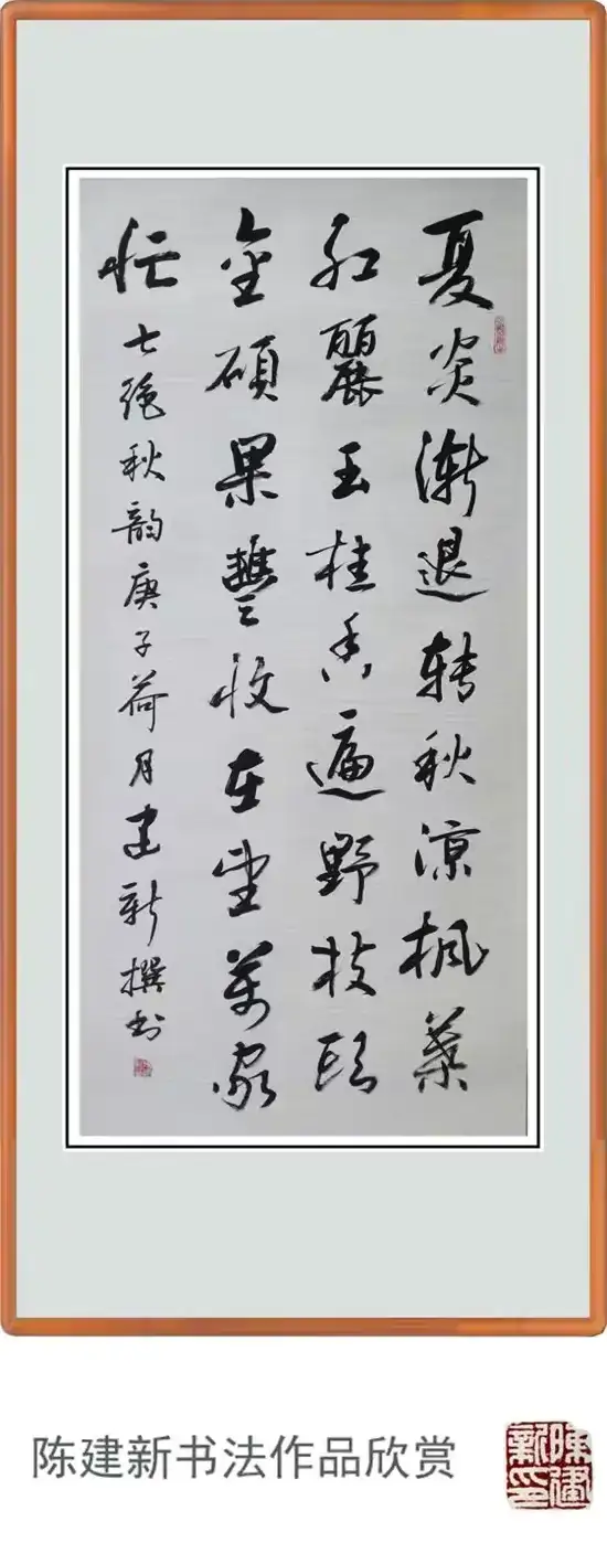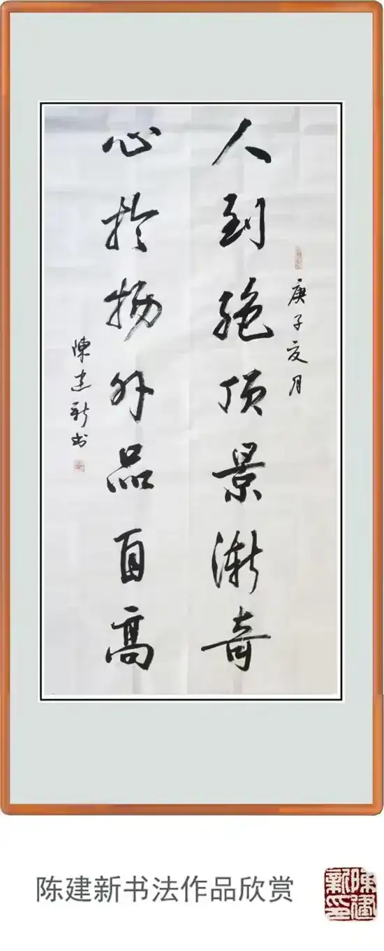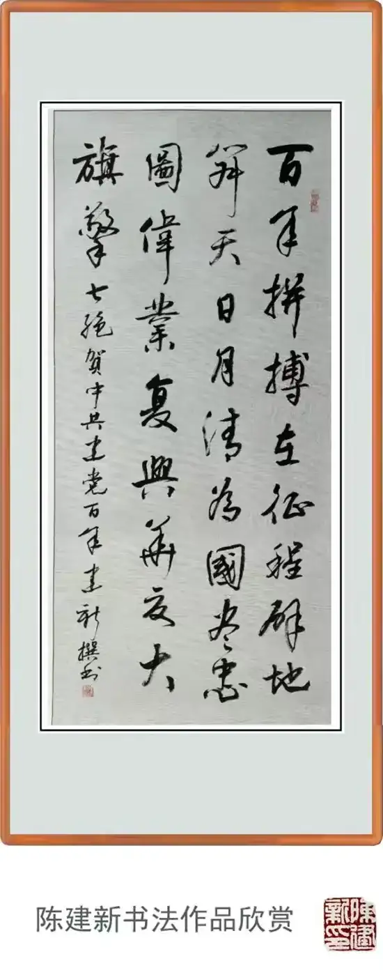 陈建新,笔名剑心,别号卧龙斋主,1959 年 8 月出生于浙江温州,1987 年毕业于浙江大学。中国当代诗人,收藏家,全国书画艺术委员会顾问,央媒文化组委会艺术顾问,央广国际文化交流艺术委员会副主席,央广文旅文化形象交流大使;首席外交文艺家,中华文化全球推广大使,世界非物质文化遗产研究院副院长,中企报盟信息科学研究院副院长,国家美术师及润格评审委员会艺术顾问。哈佛艺术学院特聘荣誉院士,兰亭字库《陈建新楷书简体》字体设计师。国家高级书法师,非遗(书法)高级传承师,中华人民共和国国宾礼艺术家,中管院书法高级指导师。中国(香港)书法家协会名誉主席,中国书画交易中心艺委会主席。中国书法家协会会员,中国书画家联谊会会员,中国收藏家协会会员,中国硬笔书协会员。中华诗词学会会员,中国纪实文学研究会会员,中国通俗文艺研究会会员,香港文联会员。中国人物界新闻网顾问,中国中外名人文化研究会学术委员会艺术顾问,中国人民艺术网顾问。中国国际书画艺术研究会会员,水墨丹青书画院会员。中国工业合作协会国策智库专家委员会专家,中国书画家联谊会新文艺群体书画家工作委员会理事副秘书长,《新文艺》杂志编委;中国民族建筑研究会书画专业委员会理事,客座教授;中国楹联学会理事;中国楹联学会书法艺术研究会常务理事副秘书长,书画专家,《中华国粹》杂志编委;华港书画文化研究院副院长;中国互联网联盟艺术总监,副主编;国际名人百科外联部主任; 孔子美术舘签约艺术家,收藏天下全国数字电视频道栏目学术指导与特邀艺术家。东方兰亭诗社理事,东方诗人协会副主席,东方收藏家协会副主席,东方文明传播会副主席,兼任总会管理委员会委员。书画作品入编《中国美术选集》,书法作品入编《世界艺术家大辞典》《新时代四十年 40 家书画作品选》,《中国艺术大家典藏》,《联墨薪传书法优秀作品选》,《中国美术 70 年》,《新中国美术图鉴》,《世界华人艺术名家收藏年鉴(典藏集)》,《中华联墨宝鉴》,《百年百家》,《建党百年》,《书画大百科》,《名家档案》,《新中国当代美术图史》,《紫袍艺术家》,《大道同行》…。刊登《中国民族博览》,《解放军画报》,《新文艺》,《中国书画家报》,《联墨艺术报》,《书法报》…。个人专辑出版共和国首部外交国礼珍藏金书。书法作品多次在全国大赛中获奖。2017 年被评为中国好品牌影响力书法家,中国年度骄傲人物。2018 年荣获改革开放 40 年功勋艺术家,人民艺术家,"华夏品牌 2019 新年书画展十大书法名家。2019年被评为"艺术功勋人物","中华联墨艺术联墨双优人才",2020 年荣获“聚焦两会国际书画艺术创新人物”,"人民心中的大师","一代名家”,“全球各界贡献人物《年度之最》”,2021 年全国两会官方重点推荐人民艺术家,"时代楷模",《2022 年度全球各界顶级人物》中国艺术名家等荣誉称号,2024年中法艺术家奥林匹克名家展荣获金奖;2024中俄友谊艺术展金奖;2024蒂亚诺杯国际青少年艺术大赛金奖,国际诺贝尔文化奖,中国书画白玉兰奖。同时录入全国书画大师数据库并被誉为国宝级艺术大师,书法作品入编国宝档案。