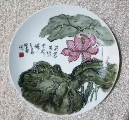 瓷刻艺术盘(出水芙蓉)直径:22㎝ 刻于:1993.10.3.
