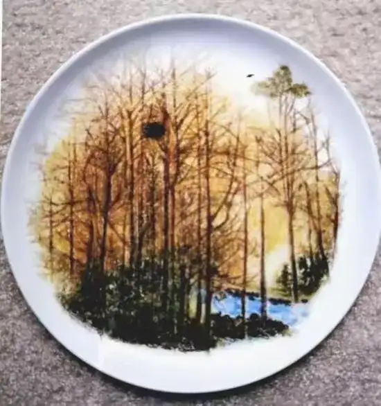 瓷刻艺术盘(寂静的山林)直径:30cm 刻于:2015.4.28.