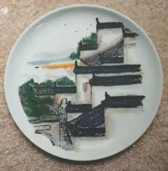 瓷刻艺术盘(炊烟)直径:23.4㎝ 刻于:2008.7.21.