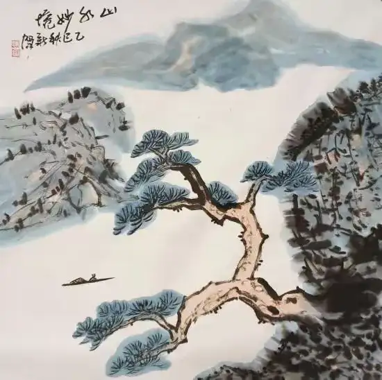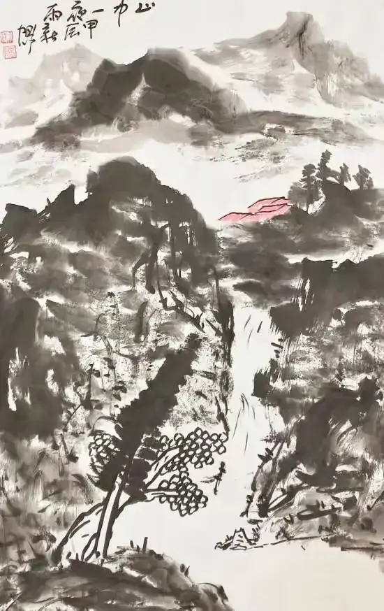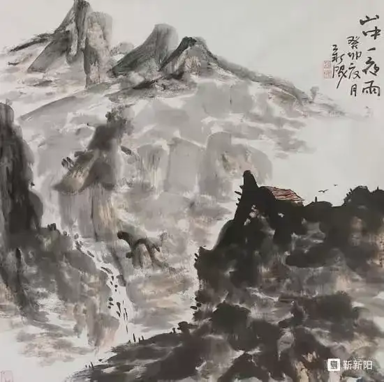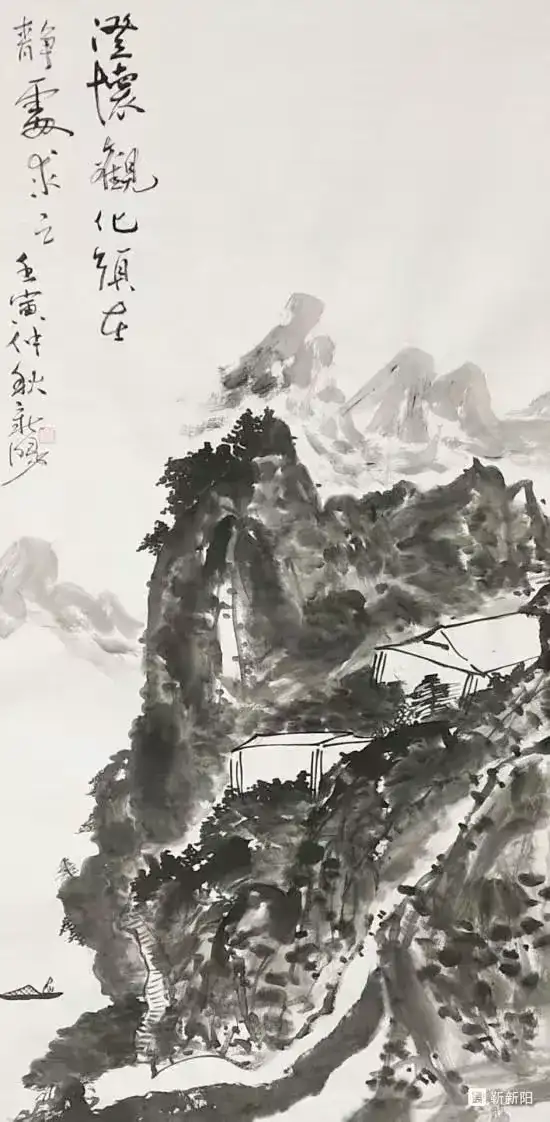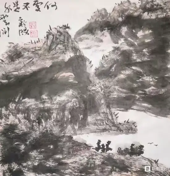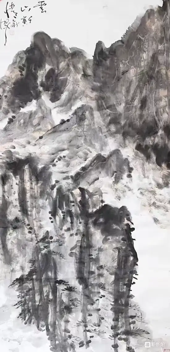 又观靳新阳的山水画总体笔墨浩荡雄浑,又有气韵生动的文化气韵。空间比例协调构图精妙,山峦层叠起伏高远蜿蜒。以书入画,笔法细腻且多变,勾勒线条刚柔并济,以令画面硬朗苍劲,期间再派生出轻柔细腻的生机活力,为山水立骨传神,可谓笔里有墨,墨里有笔,遂心应手,须臾而成,笔无下尘,空灵苍翠,在这样的山水里可以扫却一切喧嚣,沉浸在切意适性的诗意世界,享受自然山水之美,陶醉澄怀观道的觉悟。