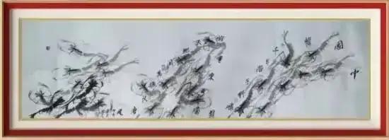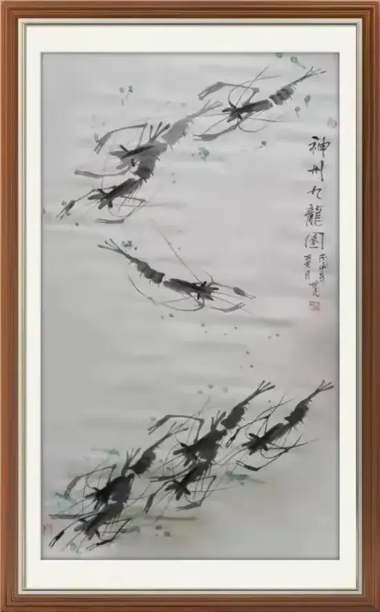 再以锋纤往来画须、画爪,骨法用笔的特征非常明显,落笔钧直,起笔痛快,焦墨写意,从来不显粗糙现象,细处里收拾得相当妥当!梳理一下画史,自古至今,除先生之外没有一人用铁笔醮墨画过虾!所以先生之画虾,借古开今,与白石的虾画相比,不缺趣味灵性,更是多了一份铁笔龙虾铸精神的格局。小题大格局,时代风范融丹青,九龙图寓神州盛!