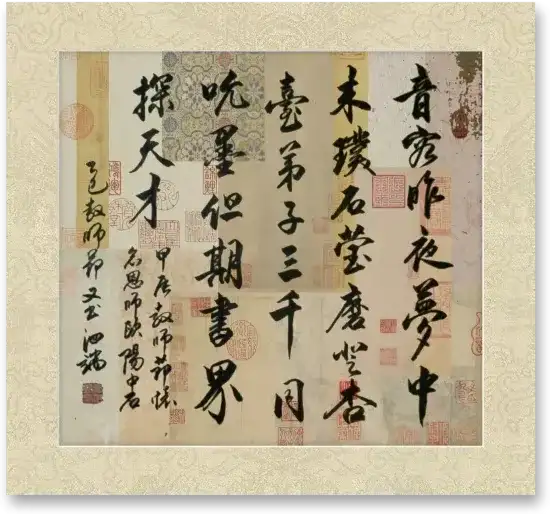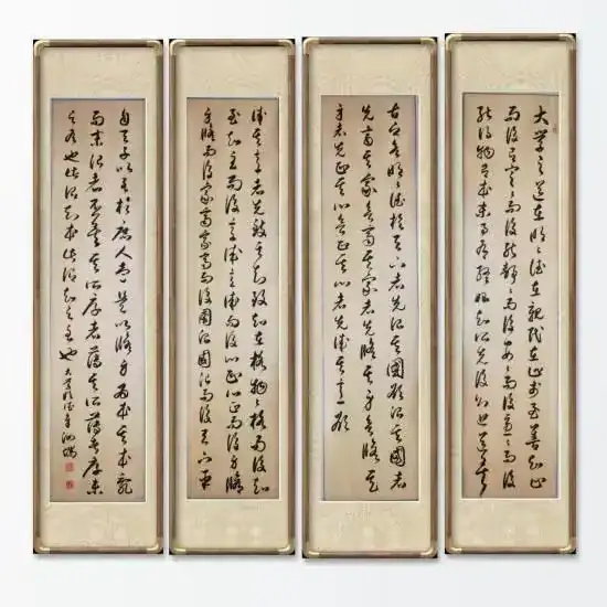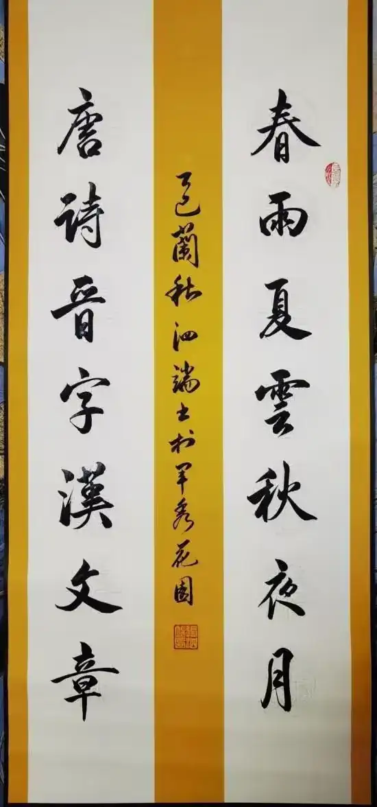 泗端书法又很讲究章法,不仅其传统样式的书法作品选宕起伏,富于变化,而且他还不断探索一些新的形式,他的一些作品就是具有这样的特点的,这些样式虽不能说是独创。但其中却代表着独特的个性,体现了作者求新求变的追求。称得上是真正的重传统,随时代,求自我。