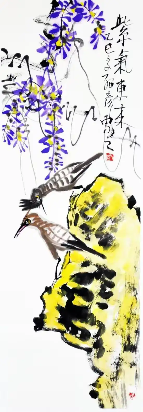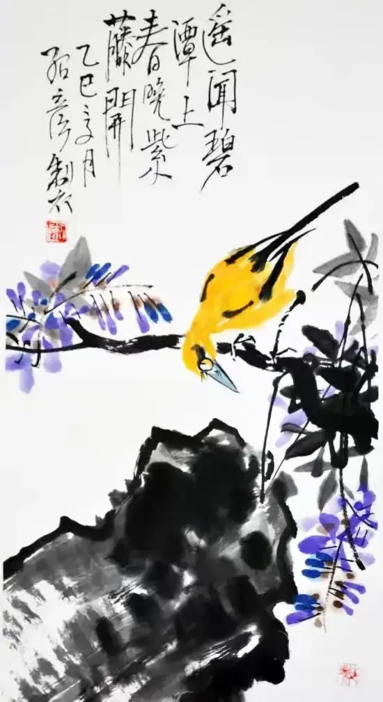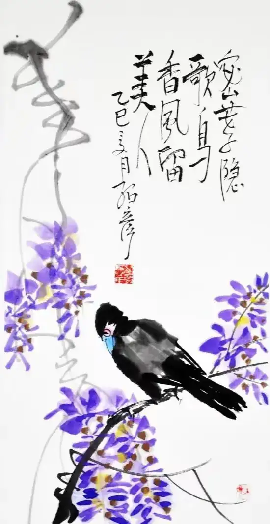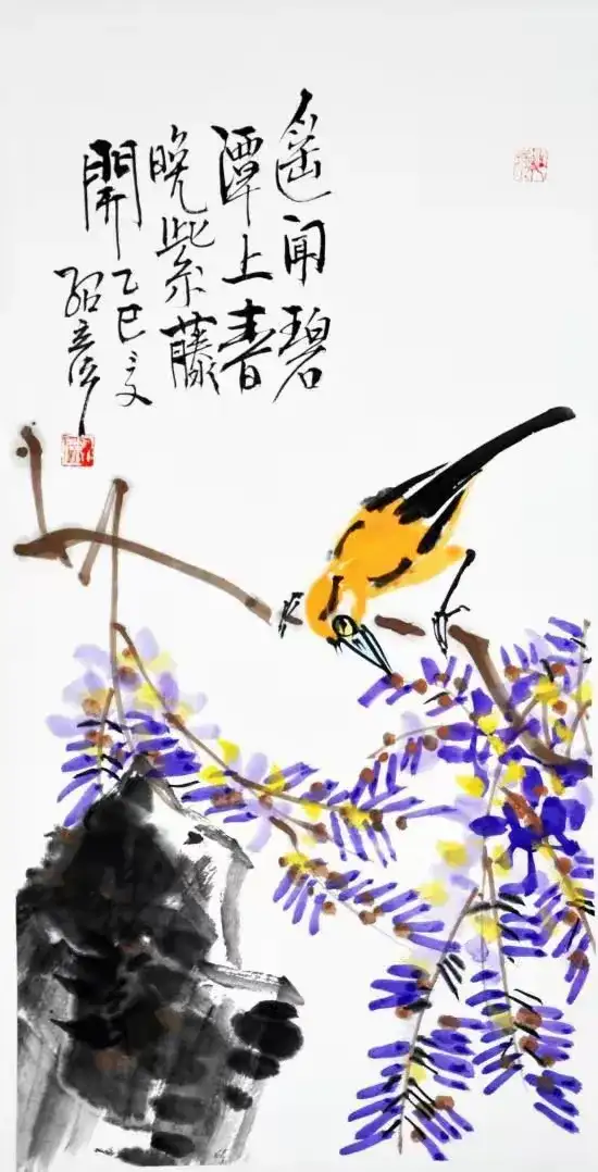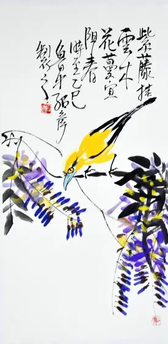 作品名称:《黄鹂紫藤》作品尺寸:68cmx34cm,创作时间:2025年,作品材质:纸本水墨