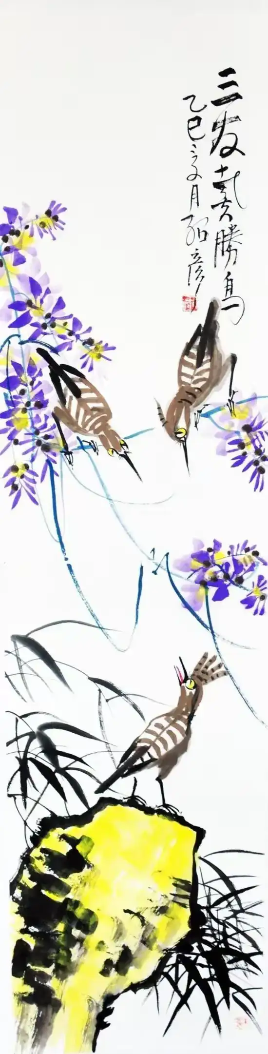 作品名称:《三友戴胜鸟》作品尺寸:136cmx34cm,创作时间:2025年,作品材质:纸本水墨