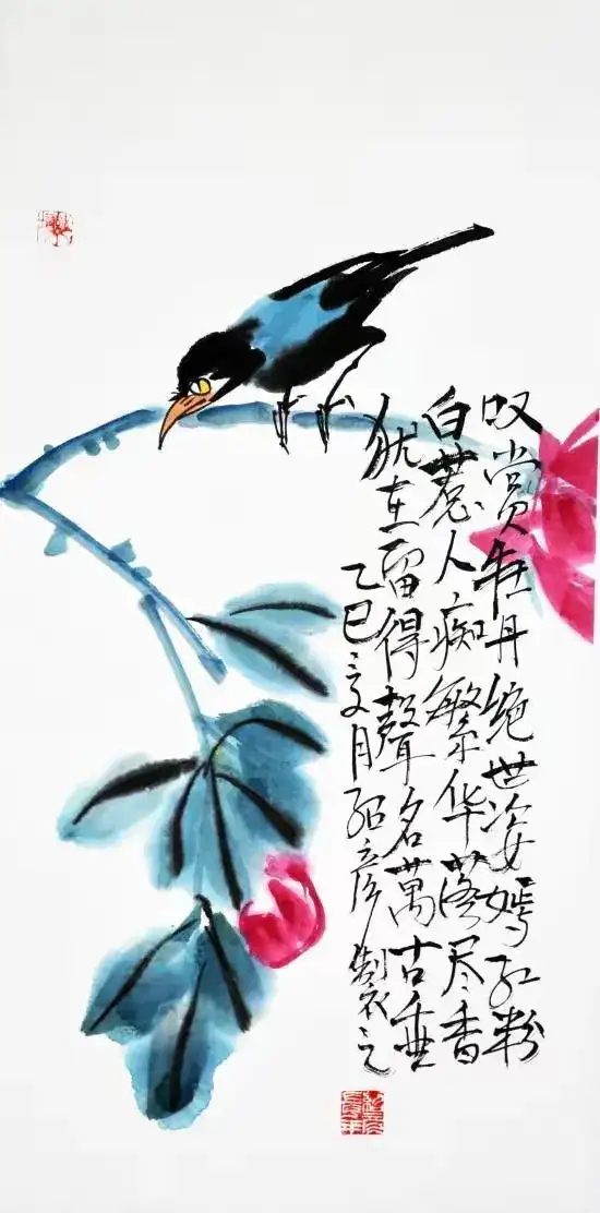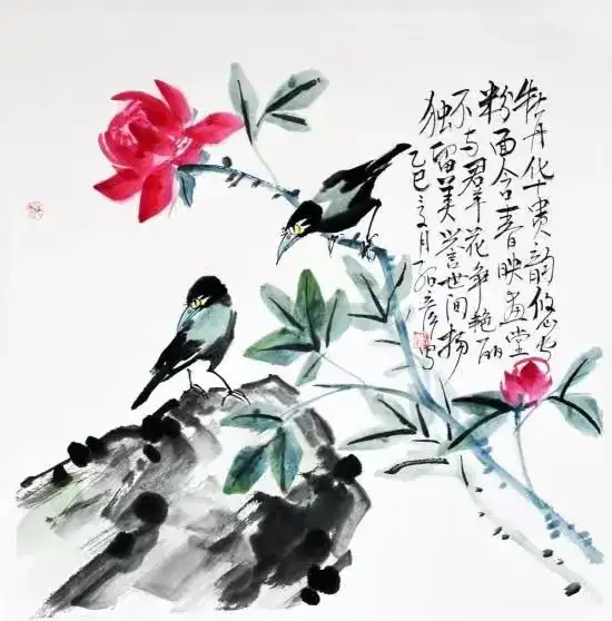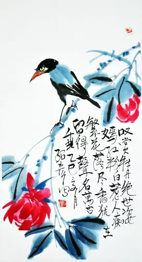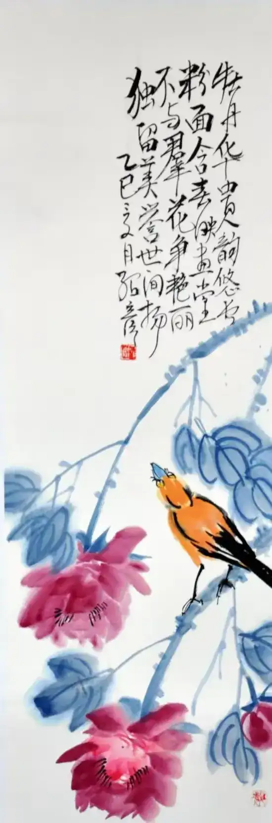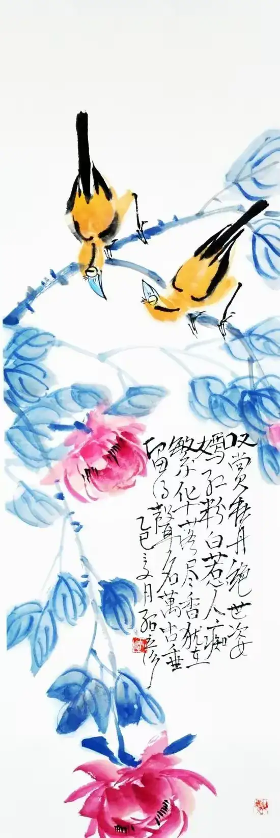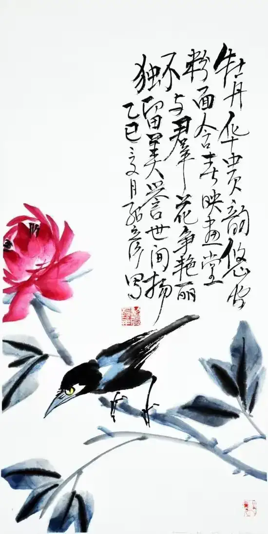 作品名称:《牡丹小鸟》作品尺寸:68cmx34cm,创作时间:2025年,作品材质:纸本水墨