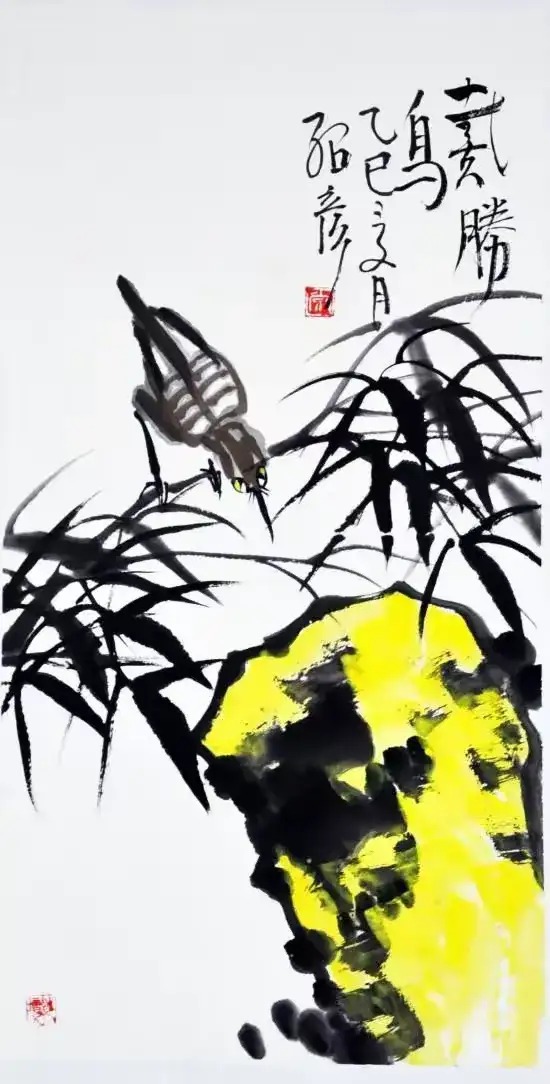 不同的是,在常绍彦的笔下,花鸟意象的追求中画家考虑的是生机勃勃表达的韵味,力求与其笔墨运用的节奏、韵律与力度相吻合,他的意象符号力求进入深层的表达内涵;因为,画家认为高明的艺术是通过对感情的震撼而进入理性的内层的,正是在如何格局中的笔墨挥洒的有规律而无定法的特点中,画家获得了理想的笔墨形式、结构表现,并注入一种不可知的力量感与内敛的张力,用以释放积蓄在内心的情感。