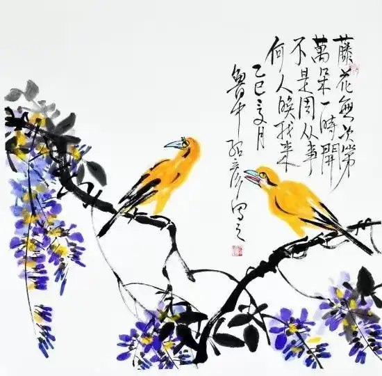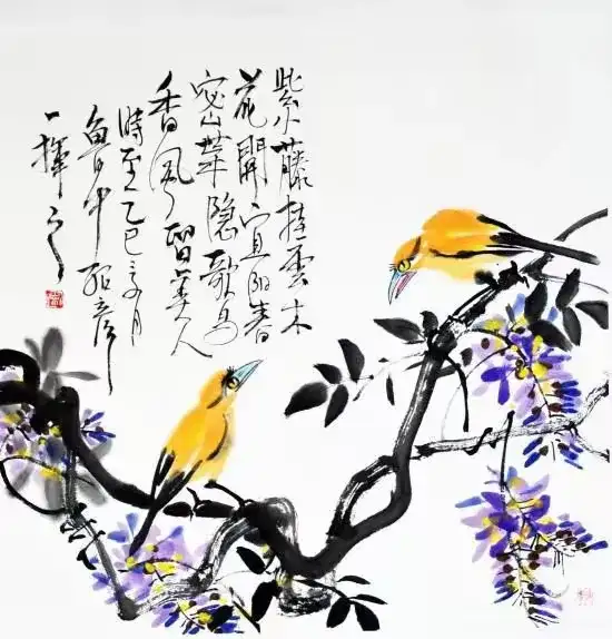 作品名称:《黄鹂藤花图》作品尺寸:68cmx68cm,创作时间:2025年,作品材质:纸本水墨