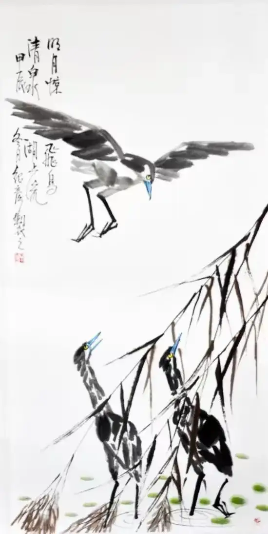 作品名称:《明月惊飞鸟》作品尺寸:136cmx68cm,创作时间:2025年,作品材质:纸本水墨