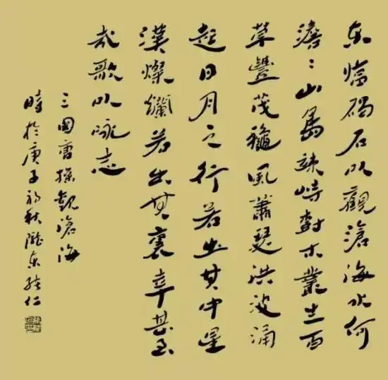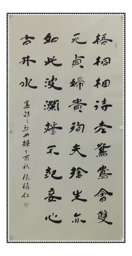 现在一件一件观赏张绪仁的书法作品,整体感觉一个人的书法要得到关注承认,技巧层面之外的东西一定要有,不能缺少,比如文人的气质风度、学者的见地学识,只有些方面的修养结合笔墨的铺陈,才会写出《明月松间照》这种充满书卷气质的书法优品。现在看书法现象,其实乱相还是比较多的,乱相之一就是书法与修养两张皮,剥离开来,书法成为单纯的技术性科目,导致书法文化传播呈现浅薄化和内涵的荒漠化。想一想,如果王羲之就是一个只重视书法技法的“书匠”,缺少感怀天地的修养积累,那么无论如何也写不出《兰亭序》这种文章与书法双重质优的作品千古流传。张绪仁先生在历练书法,向前贤学习的过程中,是敏锐地觉察到习成书法不能尽学碑帖的技术法度,还要全方位是求学于先贤的修养,把碑帖练到娴熟,把修养攀到高处,这时候下笔如有神,他的学问和品格就在笔墨里有着自然而然的表现,所以你看他的书法作品,诸如小章草说明文字《红军过草地》《袁隆平生平简介》等等作品,字里行间就反应着文人著文的精神状态和主旨高度。这些书法,或者说这些字,经由艺术家的心境投射,就像镜子一样,反映着一个国家、一段历史、一个民族的精神面貌。从这一点来看张绪仁的书法借古开今天,就有了笔墨当随时代的领导力!他作为当代一位优秀的书法家,是名到实归,名幅其实的。