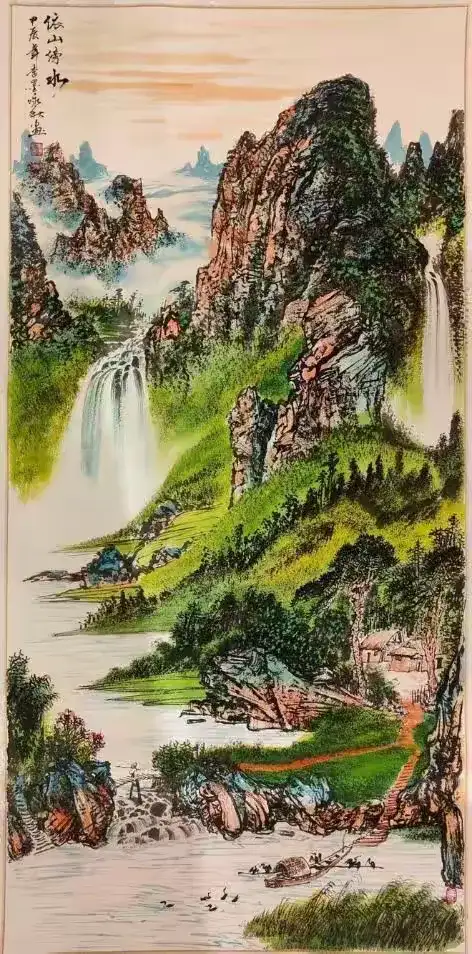 “顺”是他笔墨的境界。“狂”的背后,是“顺”的支撑——笔法的流畅,墨色的过渡,构图的平衡,都体现出他对“笔墨韵律”的掌控。在表现漓江、江南等秀美的山水时,他的笔墨会变得“温润”,线条柔和,墨色清淡,留白恰到好处,尽显山水的灵秀。比如《江南春雨》,他用淡墨勾勒远山,用湿笔点染垂柳,用留白表现烟雨,整幅作品清新淡雅,如诗如画。这种“顺”是对笔墨的驾驭,更是对自然的敬畏——山水有自己的节奏,画家要做的,是让笔墨“顺应”山水的节奏,让情感“融入”山水的气韵。