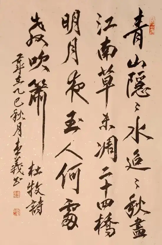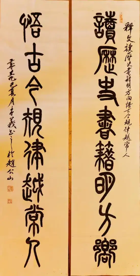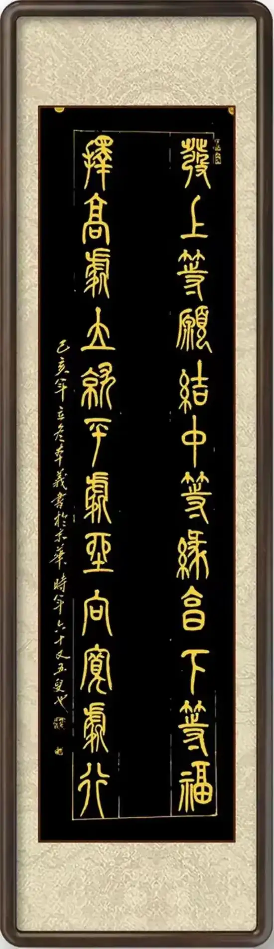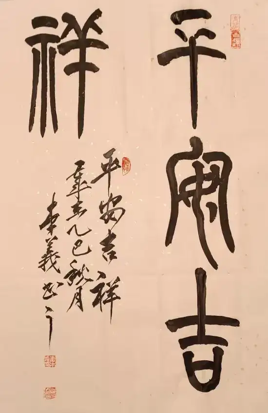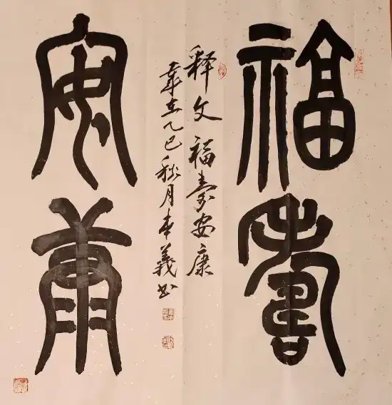 娄本义先生磨砺书道,有穷研篆籀的觉悟。取法泰山碑的正大气象,参意峄山笔的典雅圆活,把篆书一体写得饱满圆厚,丰姿多神。很善于笔法的使转策略,转笔处多,逸转而过,不是俗笔的转折成滞,自始致终可以把中锋行笔控制得游刃有余。所以他的篆书笔意很滑畅,绝无结与节,这是贵得笔法的根基,也是把篆书写得刚柔相济的重要资粮。善作篆书者,既是寻到了书法用笔的本与源!依源本觉悟书道,水到渠成!