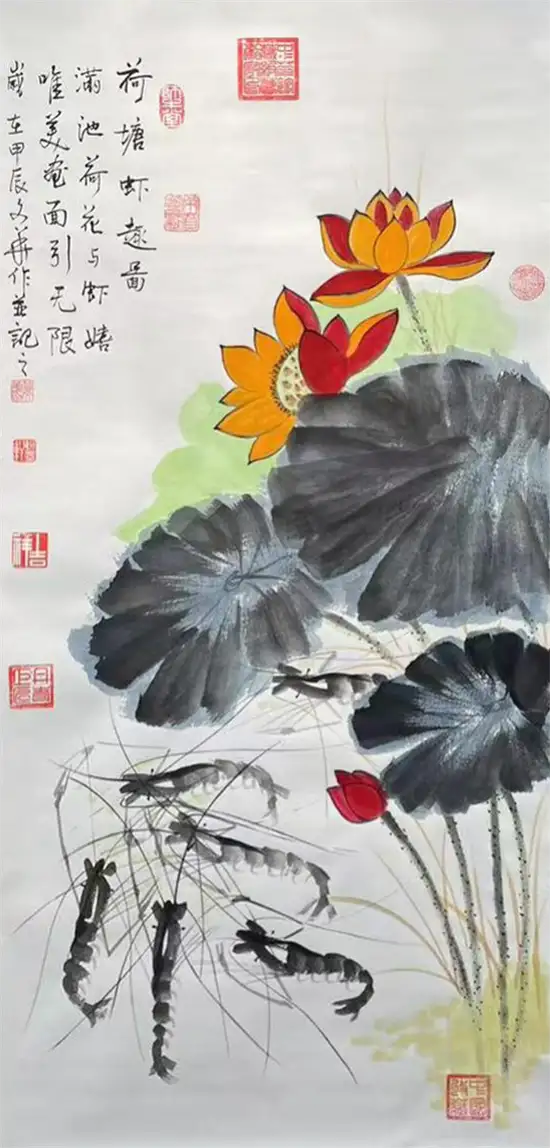 《荷塘虾趣图》