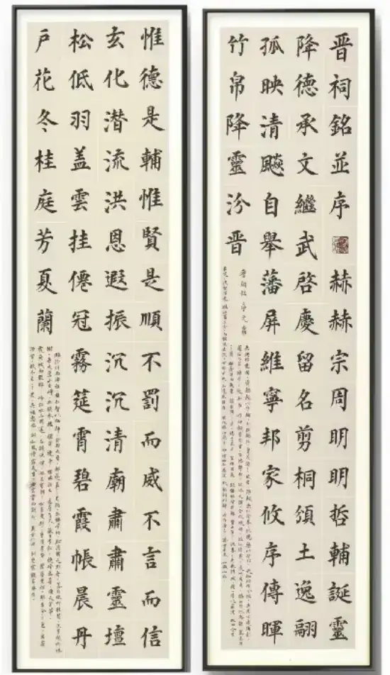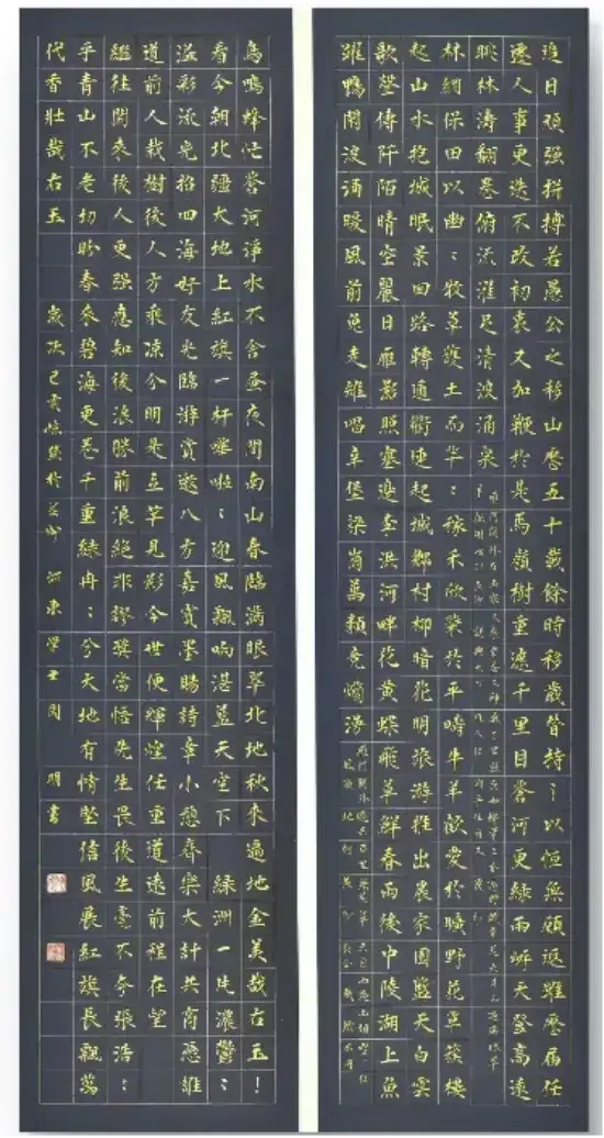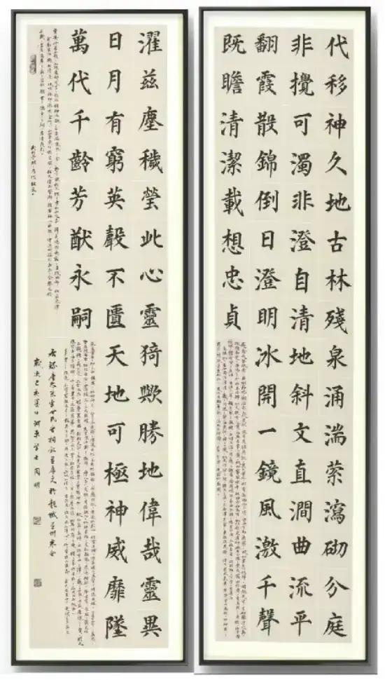 他的楷书涉及到的取法相当宽博,近乎是集成了楷书从魏晋小楷的圆活生动,到大唐楷法的严谨精研,再到明清楷书的精益求精,一路修习而来,系统梳理了小楷、中楷、大楷以致擘窠大字的流变与激变,把“楷法无欺”的功夫历练到了炉火纯青,博涉多优。