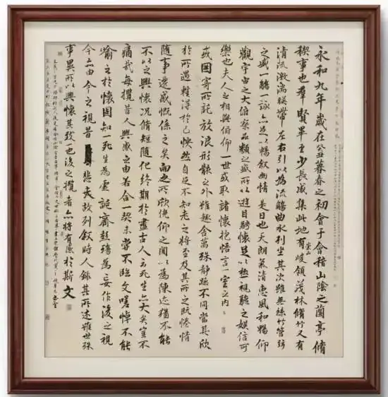 作为一名当代文人典范,周明的书法不断凝聚书卷气息,致力于让书法再次呈现晋韵宋意的天质自然。他有这种弘愿,也有这等成果。其行书精临兰亭序,写得天朗气清,惠风和畅。雅集精髓同样是如复旧观,就是与冯本并列在一起,以令世莫能辨的“真迹”!这得下多大的功夫,才能“今之视昔亦如后之视今”。在取法文人法帖的基础上,周明的行书亦能做出遂心应手在自我表达。放手写心再作《唐太宗百字箴言》,书卷气息扑面盈心,自然是赏心悦目。写下《观海听涛》最是牵丝映带,刚柔相济的书道证见。