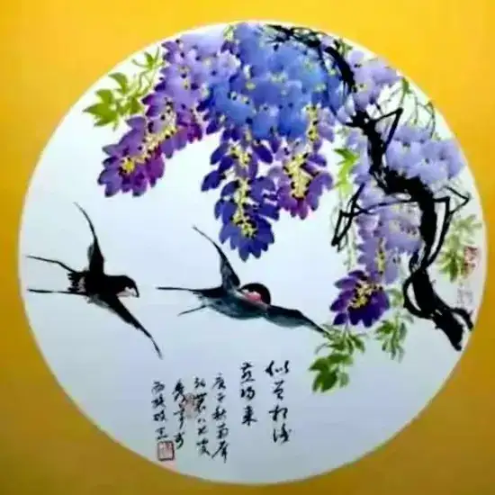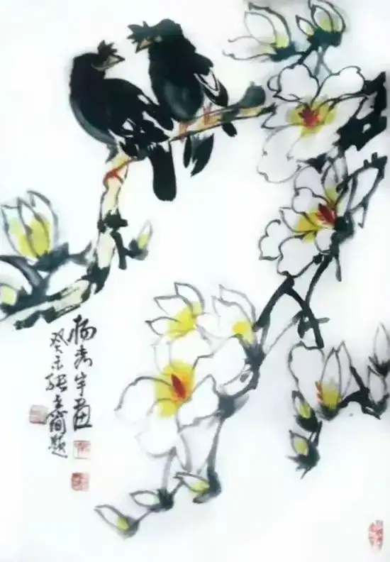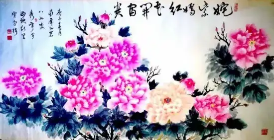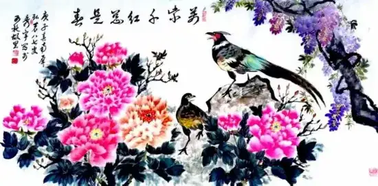 在浮躁焦虑的当代画坛,在商品市场不断愰动八尺画案的今天,杨秀宇以苦行僧般的虔诚和真诚探寻在绘画的道路上,以追求真功为本,扎实绘画,认真从艺,从来不被浮云遮眼,更不为趋利蔽目,而是,潜心学术,心无旁骛地专注于自己的绘画,他执着地按照自己的心绪寻找自己的艺术空间,处深邃静心之途而游刃有余,积大道于心源而独出新貌,跌宕起伏的韵律和千变万化的笔法交织在多姿多彩花鸟、牡丹中,演绎别样的艺术天地。笔者徜徉在杨秀宇流光溢彩的牡丹、花鸟王国,仿佛置身于美妙绝伦的艺术殿堂,他笔下千姿百态、绰约多姿的牡丹、花鸟,飘逸处洒脱隽永、清新处淡雅秀丽、典雅处雍容华贵、老辣处酣畅恣肆。他善于通过书法入画的用笔勾勒枝叶,比如《花开富贵》、《春色满园》、《春韵》,在枝叶上尽情发挥笔墨的变化,或中锋或侧锋或逆锋或拖笔等等多种笔法并用,让枝干富有质感,凸显枝干的婀娜姿态,使墨的淋漓状态以及用笔的老辣气息尽显其中,彰显骨法用笔、气韵生动的艺术效果。他通过大红、大紫、藤黄等色彩点缀花瓣、花蕊,淡色、浓色错落叠加,互生奇妙,比如《姹紫嫣红》、《富贵有期》、《百花丛中》他灵活运用色彩的变化留出花瓣、花蕊的空间,以花瓣、花蕊为中心,在花瓣、花蕊的周围,或扫或勾或染,加强色差、色温的对比,反衬靓丽的色彩,笔法千变万化、随意生发,渲染出花蕊、花瓣娇艳欲滴的万种风情,使花瓣、花蕊在纵横的笔墨中,墨色交融生辉,层次分明、虚实相生。在构图方面,杨秀宇喜欢造险,然后,险中求绝,险绝与平正之中,他寻求一种平衡,飘逸与稳定之间,他探索一种兼容,浓淡相宜、动静相生、疏密得当,他以墨枝、淡叶衬花瓣、花蕊,突破了红花一定要配绿叶的程式化,除却了艳丽柔媚之气,充分表达出牡丹、花鸟的高贵端庄和雍容华贵的气质,从而,使画面富有和谐的韵律和微妙变化的节奏,画面充满视觉的张力,色鲜不失庄重,墨浓不失灵动,繁密绝不杂乱,艳丽绝不俗媚,充满美轮美奂的装饰效果。