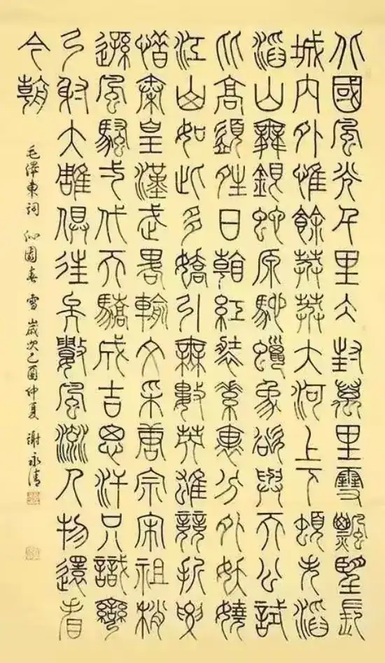当我们将目光定格在谢永清先生的篆书作品时,书中那种古典的士子格调,更是会从笔笔铁线中扑面而来。他以《泰山刻石》的玉筋格调为基础,又深度研学李阳冰之笔风,将铁线篆法于当今书坛重现风采。整体章法空间更是具有极强的构成意识,方圆有致,转运流畅,由此集字成篇,不禁让人联想到古人所言:“即一字之法,贵在结构:一笔之法妙在起止。结构之道,尤在乎笔法之精妙也。”与古人笔意相连接,与古人情思相融通,谢永清先生的篆书,正如同是千年古琴上流淌的清音,可以在当代书坛奏响一曲典雅之乐,有古法可循,令世人叹服!