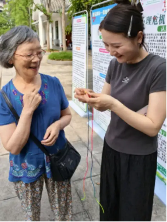 活动现场,非遗手工人化身“文化导师”,手把手指导参与者创作。康复者小罗在编织平安结时频繁出错,绳编传承人杨文艺老师蹲下身轻声提醒:“左手压线,右手绕圈,像春风拂过柳枝一样自然。”泥塑台前,曾老师示范捏塑梨花瓣的技巧,康复者小张专注修整陶坯,感慨道:“捏土的时候,心里那个躁劲儿好像被土吸走了。”心理咨询师驻场提供“一对一”疏导,针对康复者情绪波动给予即时支持,并通过“手工成果分享”环节鼓励讲述创作心得。